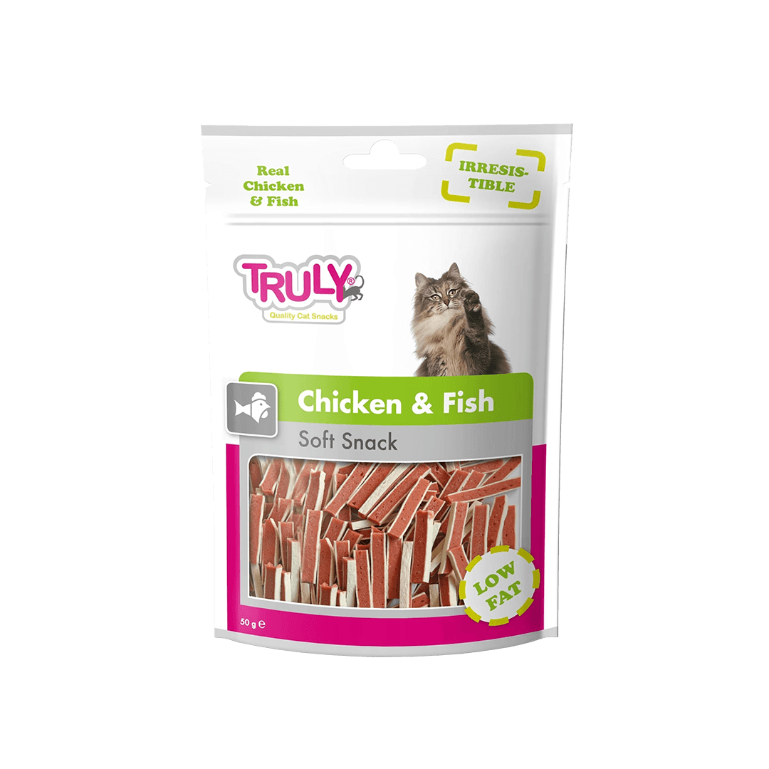 Truly Chicken & Fish Soft Snack Cat Treat 50gm offers a tender, protein-rich treat that combines real chicken and fish, perfect for cats of all ages.